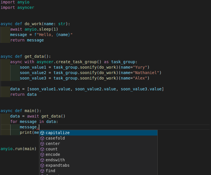 Because of the way Asyncer is designed, you will get typing support in these SoonValue