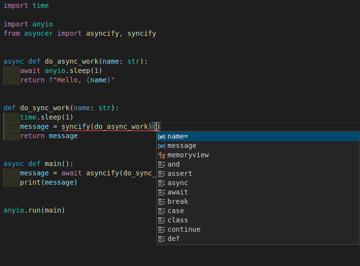 Of course, as with the rest of Asyncer, you will get typing support for the function arguments, the return value, etc: